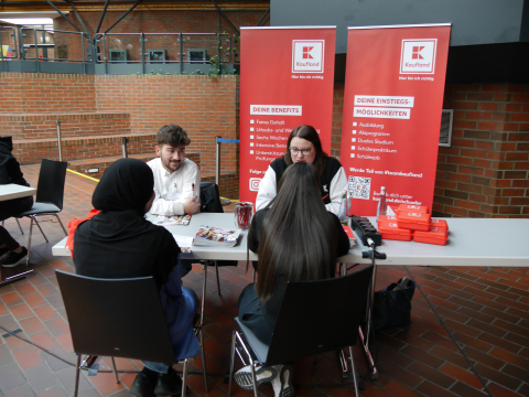 Am Dienstag, den 06.05.2025 war es dann so weit: Ausbildung im Quartier lud zum ersten Aktionstag Einzelhandel von Ausbildung im Quartier ins Dietrich-Keuning-Haus ein. Acht Dortmunder Ausbildungsbetriebe und das Jugendberufshaus der Agentur für Arbeit waren gekommen, um sich und ihr Ausbildungsangebot den Schüler*innen der 12 AiQ-Projektschulen vorzustellen und mit interessierten Schüler*innen und deren Eltern ins Gespräch zu kommen. Rund 45 Schüler*innen und sieben Elternteile nahmen in ihrer Freizeit die Gelegenheit wahr, sich über die Ausbildungen im Einzelhandel, Karrieremöglichkeiten und Ausbildungs- und Praktikumsstellen zu informieren und sich bei interessanten Unternehmen persönlich vorzustellen und zu bewerben. Auch wenn die Besucherzahl etwas hinter den Erwartungen zurückgeblieben ist, bestätigten doch die teilnehmenden Betriebe, dass die geführten Gespräche dafür qualitativ hochwertig waren und sich der Tag aus ihrer Sicht somit gelohnt hat. Es konnten erste Praktika vereinbart oder angebahnt und auch Ausbildungsbewerbungen auf den Weg gebracht werden. Besonders erfreulich, dass sich auch Schüler*innen erfolgreich vorstellen konnten, die nach Aussage der Betriebe auf Grund der vorliegenden Zeugnisse im regulären Bewerbungsverfahren eher keine Chance bekommen hätten.